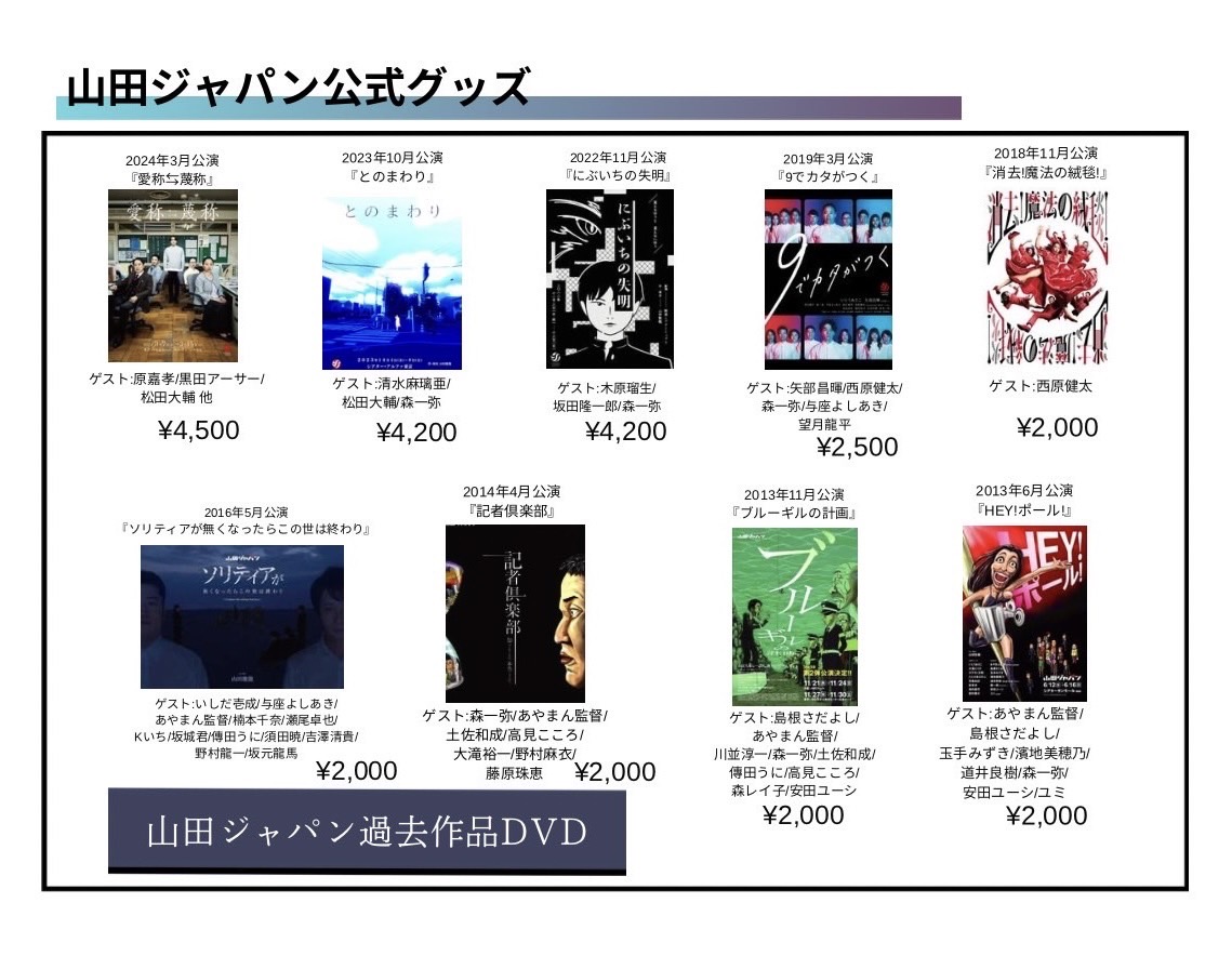 尚、10月1日(水)より、チケットをお持ちでないお客様にも、劇場にて公演パンフレットのみご購入いただけることとなりました。さらに、10月2日(木)より、BASE【公式】山田ジャパンSHOPでもご購入いただけることとなりました。詳細は、上記【物販】欄にてご案内しておりますので、ご確認ください。