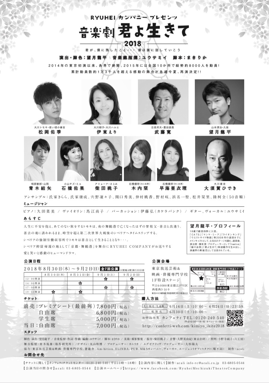 浜名一聖が、今夏4度目の再演となる音楽劇『君よ 生きて』に、アンサンブルキャストとして出演させて頂けることになりました。