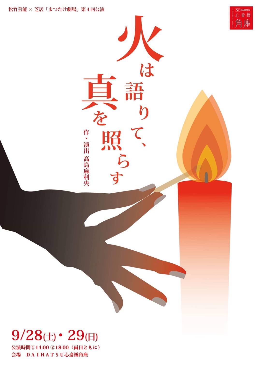 松竹芸能×芝居 まつたけ劇場 第4回公演 「火は語りて、真を照らす」 日時:9月28日(土)、29日(日) 各日 14時~/18時~ 開演 場所:DAIHATSU心斎橋角座 出演:高島麻利央、和泉大輔、竹本真之、海徳桃代 […]